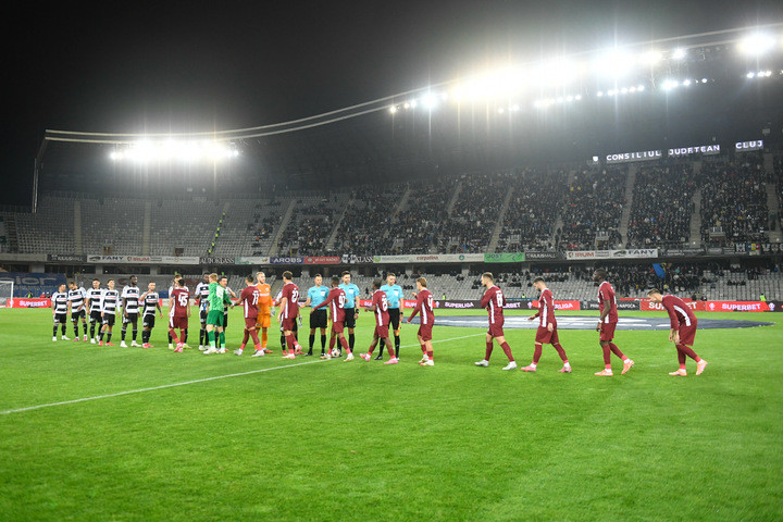 Descriere: Fotbalistii celor doua echipe se saluta inaintea meciului de fotbal dintre FC Universitatea Cluj si FC CFR 1907 Cluj, contand pentru Superliga Superbet, desfasurat pe Cluj Arena din Cluj-Napoca, luni 29 septembrie 2025. © FOTO:Flaviu Buboi/SPORT PICTURES
