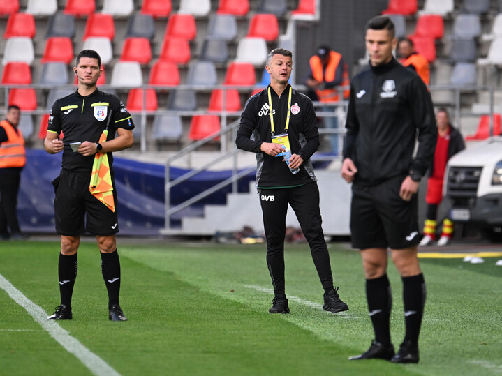 Descriere: Ovidiu Burca reactioneaza alaturi de arbitrul de rezerva Marius Daniel Badoiu in meciul de fotbal dintre Steaua Bucuresti si Sepsi OSK Sfantu Gheorghe, contand pentru Liga a-2-a Casa Pariurilor, desfasurat pe Stadionul Steaua-Ghencea din Bucuresti, marti 30 septembrie 2025. © FOTO:Razvan Pasarica/SPORT PICTURES