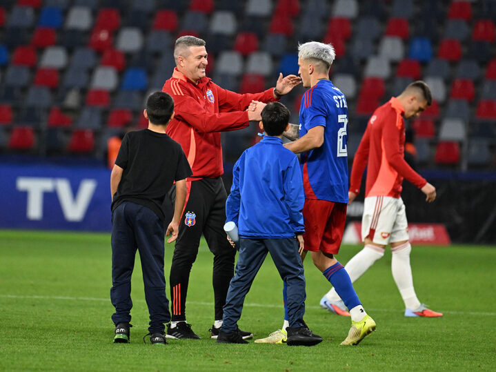 Descriere: Daniel Oprita il felicita pe Andrei Marian Lascu dupa meciul de fotbal dintre Steaua Bucuresti si Sepsi OSK Sfantu Gheorghe, contand pentru Liga a-2-a Casa Pariurilor, desfasurat pe Stadionul Steaua-Ghencea din Bucuresti, marti 30 septembrie 2025. © FOTO:Razvan Pasarica/SPORT PICTURES