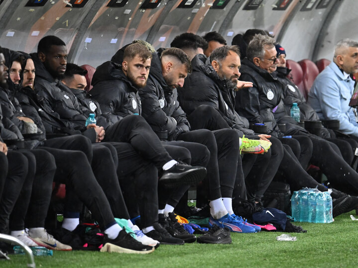Descriere: Banca ros albastra cu Denis Alibec, Mamadou Thiam, Mihai Răzvan Udrea, Lukas Zima si Marius Popa in meciul de fotbal dintre FCSB si Young Boys Berna, contand pentru UEFA Europa League, desfasurat pe Arena Nationala din Bucuresti, joi 2 octombrie 2025. © FOTO:Razvan Pasarica/SPORT PICTURES
