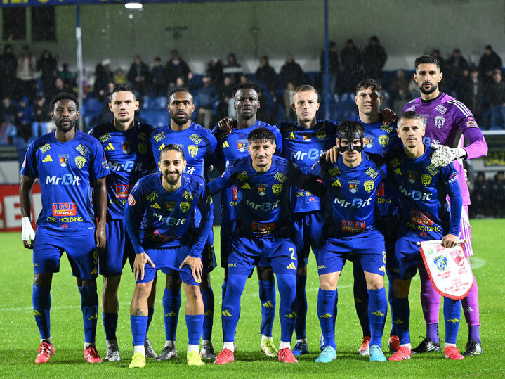Descriere: Fotbalistii ialomiteni la o fotografie de grup realizata inaintea meciului dintre Unirea Slobozia si Dinamo Bucuresti, contand pentru Superliga Superbet, desfasurat pe Clinceni Arena din Clinceni, vineri 3 octombrie 2025. © FOTO:Razvan Pasarica/SPORT PICTURES