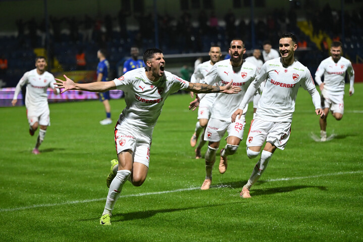 Descriere: Fotbalistii dinamovisti Stipe Perica, Charalampos Kyriakou si Raul Marian Oprut se bucura dupa un gol marcat in meciul dintre Unirea Slobozia si Dinamo Bucuresti, contand pentru Superliga Superbet, desfasurat pe Clinceni Arena din Clinceni, vineri 3 octombrie 2025. © FOTO:Razvan Pasarica/SPORT PICTURES