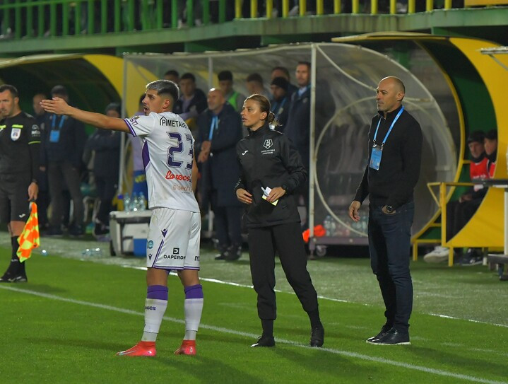 Descriere: Arbitrul de rezerva Ana Maria Terteleac, Bogdan Ioan Andone si Florin Gheorghe Borta in meciul de fotbal dintre FC Arges si FC Petrolul Ploiesti, contand pentru Superliga Superbet, desfasurat pe Stadionul Orasenesc din Mioveni,sambata 4 octombrie 2025. © FOTO:Mihai Nitoiu/SPORT PICTURES