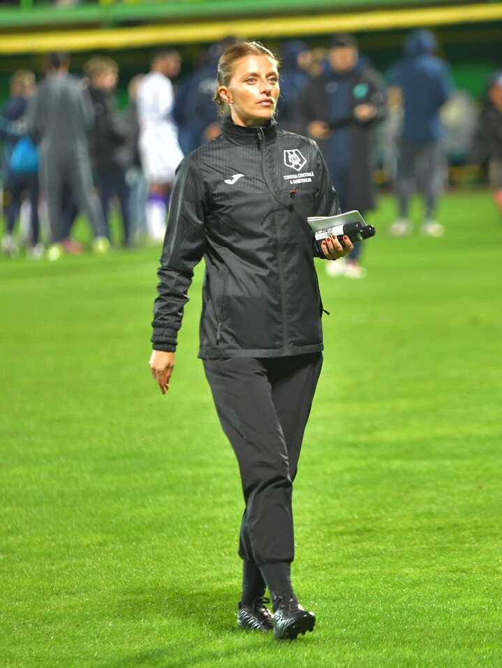 Descriere: Arbitrul de rezerva Ana Maria Terteleac dupa meciul de fotbal dintre FC Arges si FC Petrolul Ploiesti, contand pentru Superliga Superbet, desfasurat pe Stadionul Orasenesc din Mioveni,sambata 4 octombrie 2025. © FOTO:Mihai Nitoiu/SPORT PICTURES