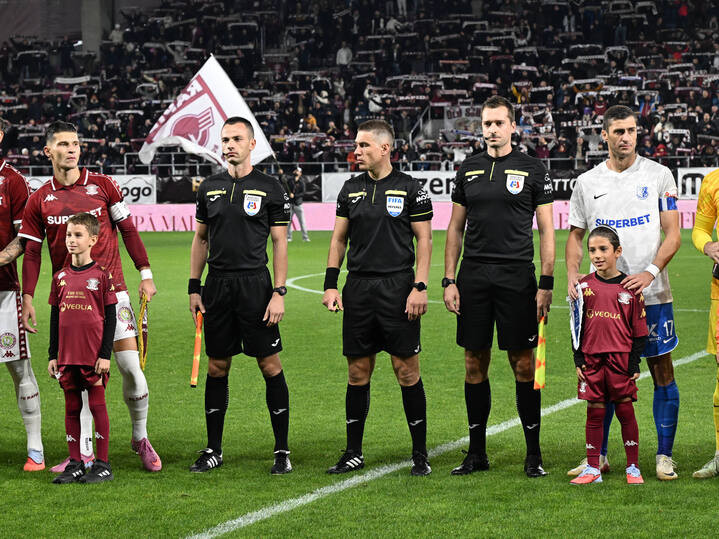 Descriere: Brigada de arbitrii formată din Adrian Vornicu, Szabolcs Kovacs si Ioan Alexandru Corb alături de căpitanii Phillipe Razvan Onea si Ionuț Justinian Larie in meciul de fotbal dintre Rapid Bucuresti si Farul Constanta, din cadrul Superligii Superbet, desfasurat pe Superbet Arena-Giulesti din Bucuresti, sambata 4 octombrie 2025. © FOTO:Razvan Pasarica/SPORT PICTURES