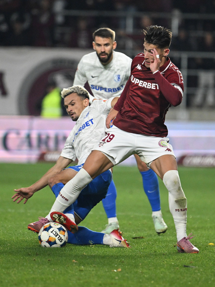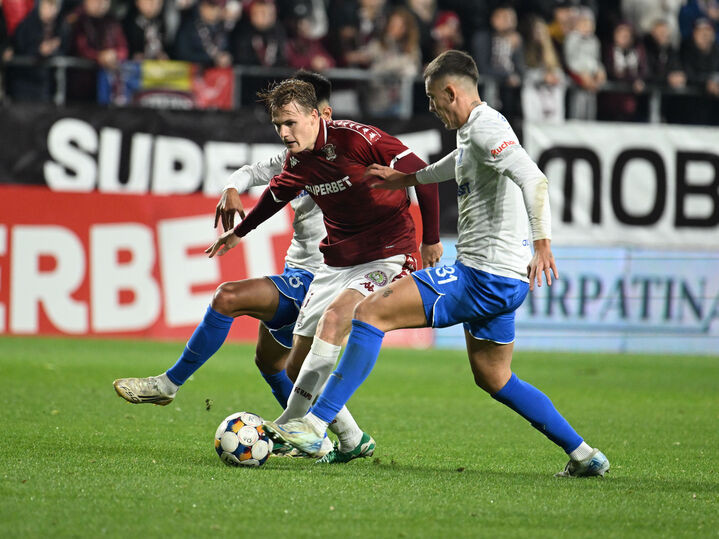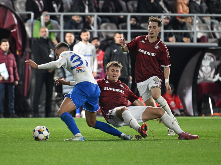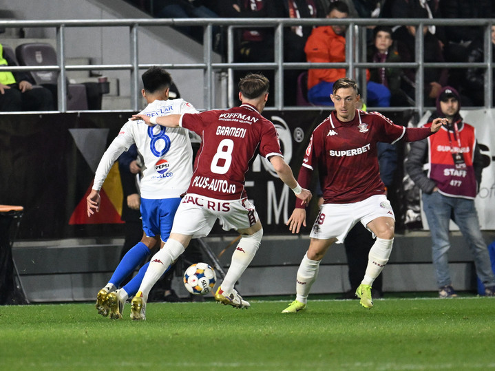 Descriere: Cristian George Ganea, Razvan Andrei Tanasa si Mihai Alexandru Dobre in meciul de fotbal dintre Rapid Bucuresti si Farul Constanta, din cadrul Superligii Superbet, desfasurat pe Superbet Arena-Giulesti din Bucuresti, sambata 4 octombrie 2025. © FOTO:Razvan Pasarica/SPORT PICTURES