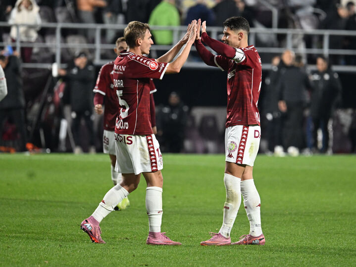 Descriere: Fotbalistii rapidisti Catalin Alin Vulturar si Mihai Alexandru Dobre se felicita dupa meciul de fotbal dintre Rapid Bucuresti si Farul Constanta, din cadrul Superligii Superbet, desfasurat pe Superbet Arena-Giulesti din Bucuresti, sambata 4 octombrie 2025. © FOTO:Razvan Pasarica/SPORT PICTURES