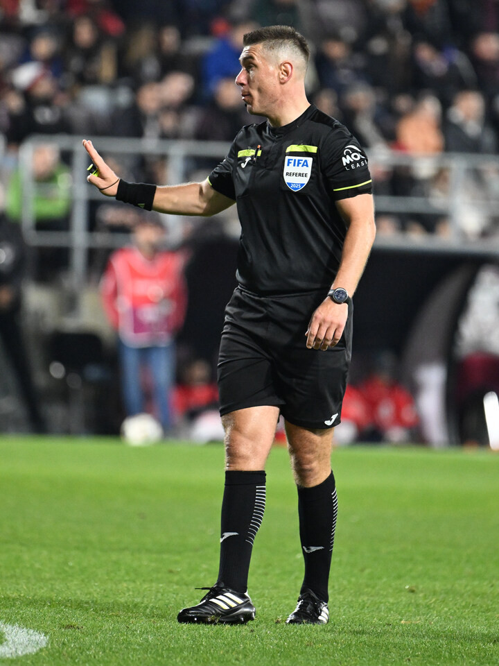 Descriere: Arbitrul central Szabolcs Kovacs reacționează in meciul de fotbal dintre Rapid Bucuresti si Farul Constanta, din cadrul Superligii Superbet, desfasurat pe Superbet Arena-Giulesti din Bucuresti, sambata 4 octombrie 2025. © FOTO:Razvan Pasarica/SPORT PICTURES