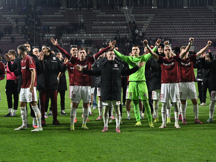 Descriere: Fotbalistii rapidisti Claudiu Valentin Micovschi, Claudiu Adrian Mihai Petrila, Franz Stolz si Cristian Marian Manea saluta galeria dupa meciul de fotbal dintre Rapid Bucuresti si Farul Constanta, din cadrul Superligii Superbet, desfasurat pe Superbet Arena-Giulesti din Bucuresti, sambata 4 octombrie 2025. © FOTO:Razvan Pasarica/SPORT PICTURES