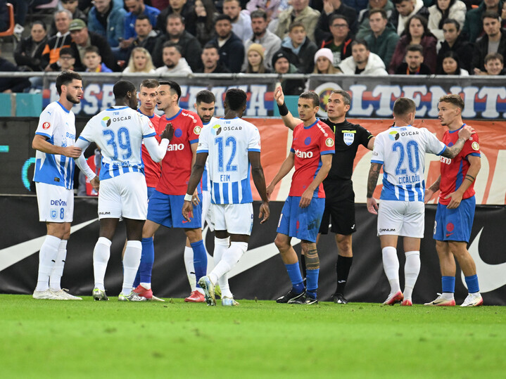 Descriere: Arbitrul central Istvan Kovacs reacționează alături de Tudor Cristian Baluta, Aime Steven Nsasa Nsimba Labe, Florin Lucian Tănase, Adrian Gheorghe Șut, Juri Cisotti, Alexandru Cicaldau si Grigoraș Alexandru Pantea in meciul dintre FCSB si Universitatea Craiova, contand pentru Superliga Superbet, desfasurat pe Arena Nationala din Bucuresti, duminica 5 octombrie 2025. © FOTO:Razvan Pasarica/SPORT PICTURES