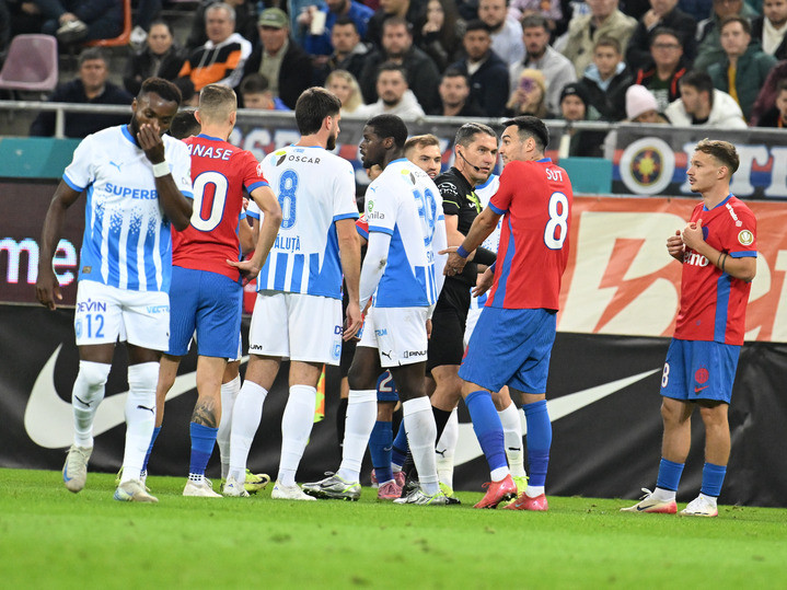 Descriere: Arbitrul central Istvan Kovacs alături de Bassey Etim Monday, Tudor Cristian Baluta, Aime Steven Nsasa Nsimba Labe, Adrian Gheorghe Șut si Grigoraș Alexandru Pantea in meciul dintre FCSB si Universitatea Craiova, contand pentru Superliga Superbet, desfasurat pe Arena Nationala din Bucuresti, duminica 5 octombrie 2025. © FOTO:Razvan Pasarica/SPORT PICTURES