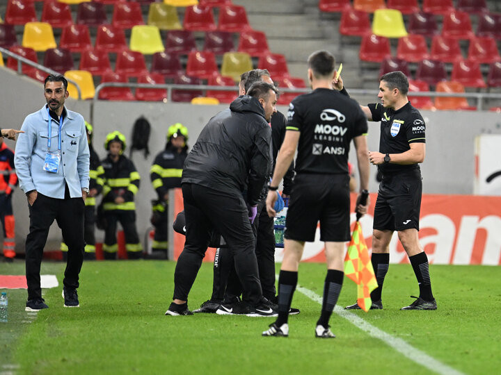 Descriere: Arbitrul central Istvan Kovacs acordă un cartonaș galben sub privirile lui Elias Charalambous in meciul dintre FCSB si Universitatea Craiova, contand pentru Superliga Superbet, desfasurat pe Arena Nationala din Bucuresti, duminica 5 octombrie 2025. © FOTO:Razvan Pasarica/SPORT PICTURES