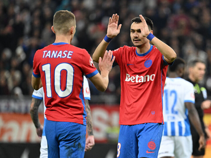 Descriere: Fotbalistii ros-albastrii Florin Lucian Tănase si Adrian Gheorghe Șut se incurajeaza in meciul dintre FCSB si Universitatea Craiova, contand pentru Superliga Superbet, desfasurat pe Arena Nationala din Bucuresti, duminica 5 octombrie 2025. © FOTO:Razvan Pasarica/SPORT PICTURES