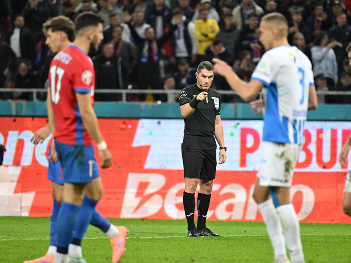 Descriere: Arbitrul central Istvan Kovacs reacționează in meciul dintre FCSB si Universitatea Craiova, contand pentru Superliga Superbet, desfasurat pe Arena Nationala din Bucuresti, duminica 5 octombrie 2025. © FOTO:Razvan Pasarica/SPORT PICTURES
