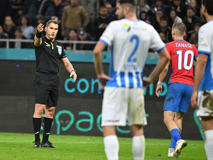 Descriere: Arbitrul central Istvan Kovacs reacționează in meciul dintre FCSB si Universitatea Craiova, contand pentru Superliga Superbet, desfasurat pe Arena Nationala din Bucuresti, duminica 5 octombrie 2025. © FOTO:Razvan Pasarica/SPORT PICTURES