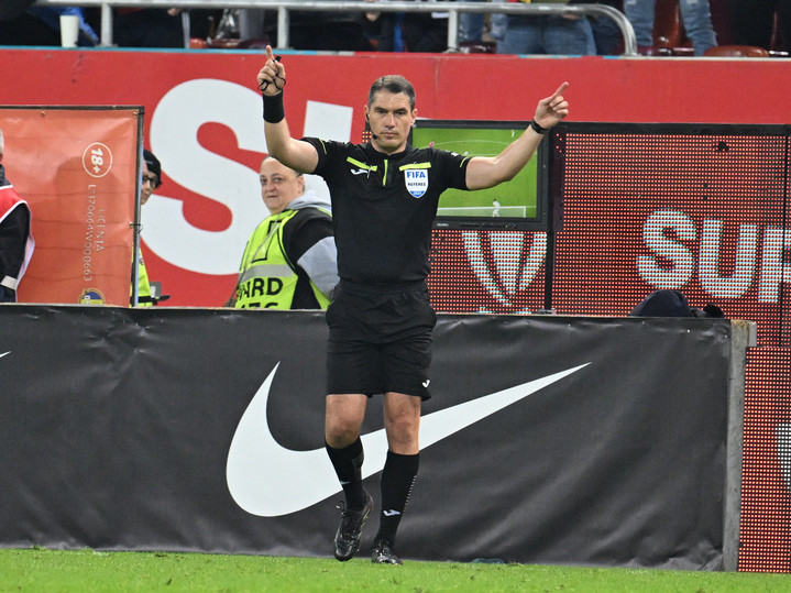 Descriere: Arbitrul central Istvan Kovacs reacționează dupa consultarea VAR-ului in meciul dintre FCSB si Universitatea Craiova, contand pentru Superliga Superbet, desfasurat pe Arena Nationala din Bucuresti, duminica 5 octombrie 2025. © FOTO:Razvan Pasarica/SPORT PICTURES