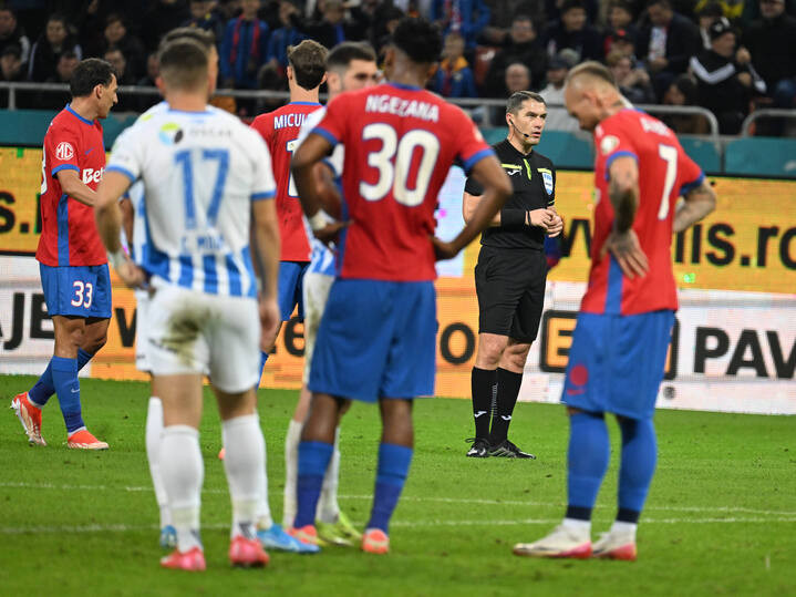 Descriere: Arbitrul central Istvan Kovacs reacționează alături de Risto Radunovic in meciul dintre FCSB si Universitatea Craiova, contand pentru Superliga Superbet, desfasurat pe Arena Nationala din Bucuresti, duminica 5 octombrie 2025. © FOTO:Razvan Pasarica/SPORT PICTURES