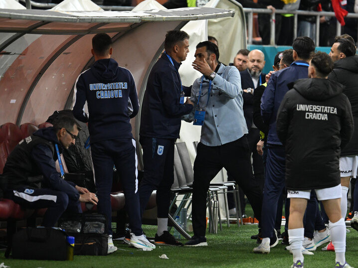 Descriere: Elias Charalambous il saluta pe Mihai Ianovschi dupa meciul dintre FCSB si Universitatea Craiova, contand pentru Superliga Superbet, desfasurat pe Arena Nationala din Bucuresti, duminica 5 octombrie 2025. © FOTO:Razvan Pasarica/SPORT PICTURES