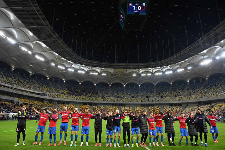 Descriere: Fotbalistii ros-albastrii Ștefan Târnovanu, Risto Radunovic, Baba Alhassan, Adrian Gheorghe Șut, Mihai Popescu, Denis Alibec, Valentin Cretu, Darius Dumitru Olaru, Florin Lucian Tănase, Dennis Dorin Politic, Mihai Răzvan Udrea, Mihai Vlăduț Toma, David Raul Miculescu, Alexandru Constantin Stoian, Juri Cisotti, Grigoraș Alexandru Pantea, Lukas Zima si Siyabonga Ngezana saluta galeria alături de tabela de marcaj dupa meciul dintre FCSB si Universitatea Craiova, contand pentru Superliga Superbet, desfasurat pe Arena Nationala din Bucuresti, duminica 5 octombrie 2025. © FOTO:Razvan Pasarica/SPORT PICTURES