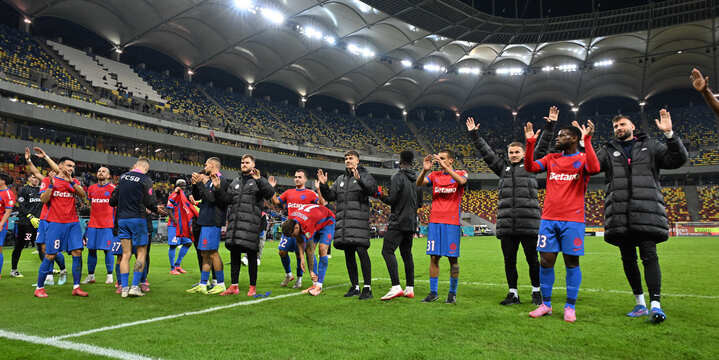 Descriere: Fotbalistii ros-albastrii Ștefan Târnovanu, Adrian Gheorghe Șut, Denis Alibec, George Daniel Bîrligea, Mihai Răzvan Udrea, Mihai Vlăduț Toma, Alexandru Constantin Stoian, Juri Cisotti, Grigoraș Alexandru Pantea, Mamadou Thiam si Lukas Zima saluta galeria alături de tabela de marcaj dupa meciul dintre FCSB si Universitatea Craiova, contand pentru Superliga Superbet, desfasurat pe Arena Nationala din Bucuresti, duminica 5 octombrie 2025. © FOTO:Razvan Pasarica/SPORT PICTURES