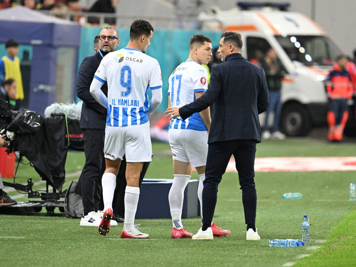 Descriere: Assad Al Islam Al Hamlawi si Carlos Andrei Mora Montoya se pregatesc sa intre pe teren sub privirile lui Matei Mirel Radoi in meciul dintre FCSB si Universitatea Craiova, contand pentru Superliga Superbet, desfasurat pe Arena Nationala din Bucuresti, duminica 5 octombrie 2025. © FOTO:Razvan Pasarica/SPORT PICTURES