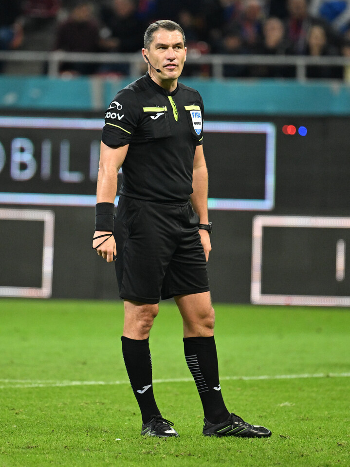 Descriere: Arbitrul central Istvan Kovacs reacționează in meciul dintre FCSB si Universitatea Craiova, contand pentru Superliga Superbet, desfasurat pe Arena Nationala din Bucuresti, duminica 5 octombrie 2025. © FOTO:Razvan Pasarica/SPORT PICTURES