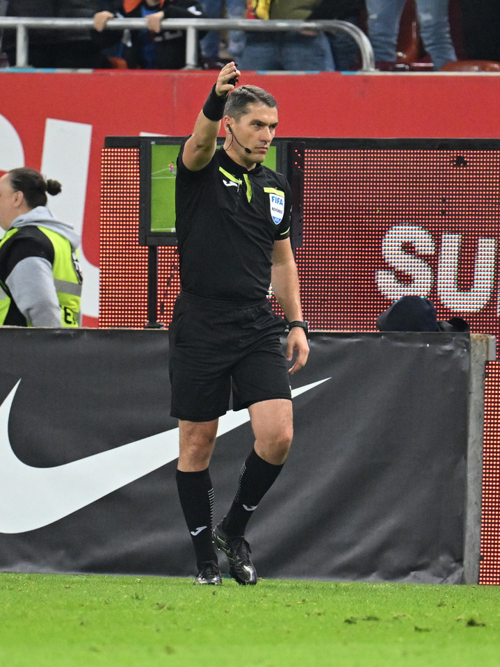 Descriere: Arbitrul central Istvan Kovacs reacționează dupa consultarea VAR-ului in meciul dintre FCSB si Universitatea Craiova, contand pentru Superliga Superbet, desfasurat pe Arena Nationala din Bucuresti, duminica 5 octombrie 2025. © FOTO:Razvan Pasarica/SPORT PICTURES