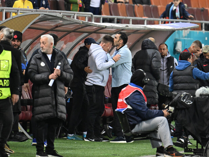 Descriere: Elias Charalambous se bucura alături de Doru Mihai Pintilii, sarutandu-l pe frunte, dupa meciul dintre FCSB si Universitatea Craiova, contand pentru Superliga Superbet, desfasurat pe Arena Nationala din Bucuresti, duminica 5 octombrie 2025. © FOTO:Razvan Pasarica/SPORT PICTURES