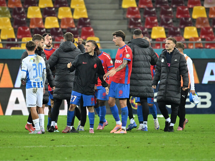 Descriere: Mihai Răzvan Udrea, Darius Dumitru Olaru, David Raul Miculescu si Grigoraș Alexandru Pantea reacționează dupa meciul dintre FCSB si Universitatea Craiova, contand pentru Superliga Superbet, desfasurat pe Arena Nationala din Bucuresti, duminica 5 octombrie 2025. © FOTO:Razvan Pasarica/SPORT PICTURES