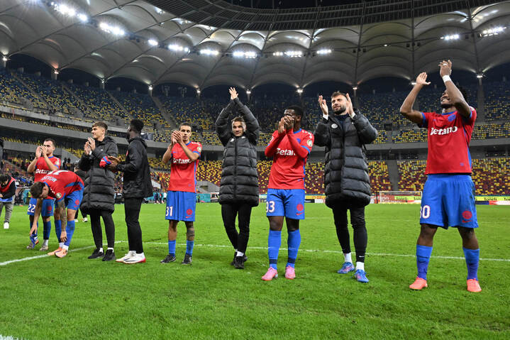 Descriere: Fotbalistii ros-albastrii Mihai Vlăduț Toma, David Raul Miculescu, Alexandru Constantin Stoian, Enagnon David Kiki, Juri Cisotti, Grigoraș Alexandru Pantea, Mamadou Thiam, Lukas Zima si Siyabonga Ngezana saluta galeria dupa meciul dintre FCSB si Universitatea Craiova, contand pentru Superliga Superbet, desfasurat pe Arena Nationala din Bucuresti, duminica 5 octombrie 2025. © FOTO:Razvan Pasarica/SPORT PICTURES