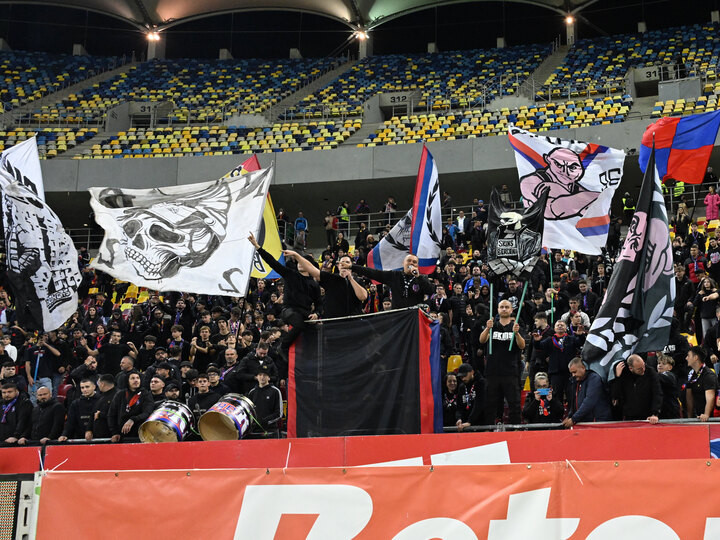 Descriere: Galeria ros albastra flutura steaguri in peluza la meciul dintre FCSB si Universitatea Craiova, contand pentru Superliga Superbet, desfasurat pe Arena Nationala din Bucuresti, duminica 5 octombrie 2025. © FOTO:Razvan Pasarica/SPORT PICTURES