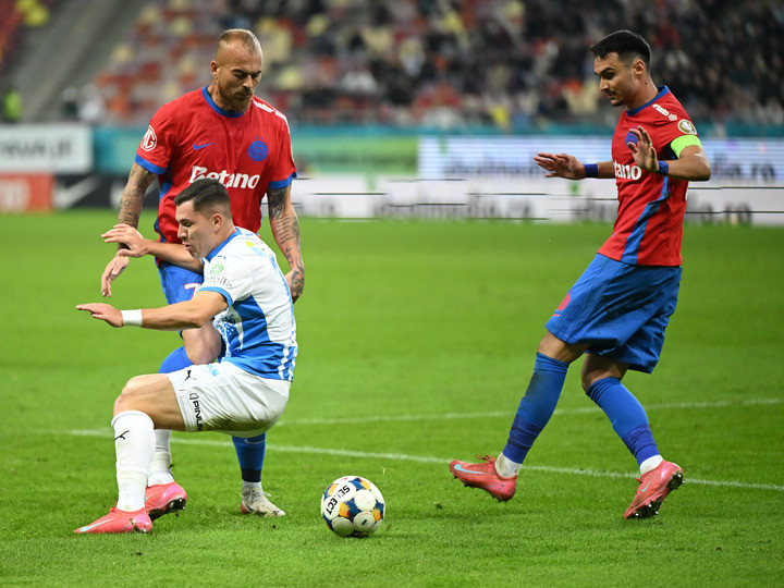 Descriere: Denis Alibec, Carlos Andrei Mora Montoya si Adrian Gheorghe Șut in meciul dintre FCSB si Universitatea Craiova, contand pentru Superliga Superbet, desfasurat pe Arena Nationala din Bucuresti, duminica 5 octombrie 2025. © FOTO:Razvan Pasarica/SPORT PICTURES