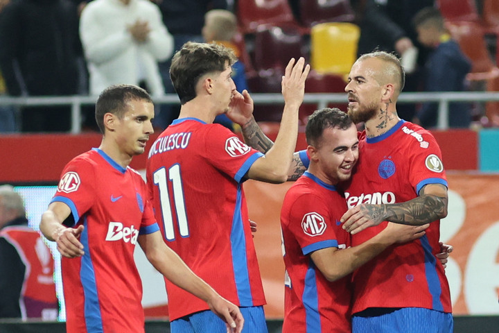 Descriere: Bucurie a fotbalistilor ros-albastrii Juri Cisotti, David Raul Miculescu, Mihai Vlăduț Toma si Denis Alibec dupa meciul dintre FCSB si Universitatea Craiova, contand pentru Superliga Superbet, desfasurat pe Arena Nationala din Bucuresti, duminica 5 octombrie 2025. © FOTO:Gheorghe Fluster/SPORT PICTURES