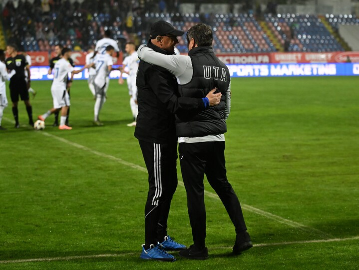 Descriere: Antrenorii celor doua echipe Leo Grozavu si Adrian Mihalcea se saluta inaintea meciului de fotbal dintre FC Botosani si UTA Arad, contand pentru Superliga Superbet, desfasurat pe Stadionul Municipal din Botosani, luni 6 octombrie 2025. © FOTO:Tudy/SPORT PICTURES