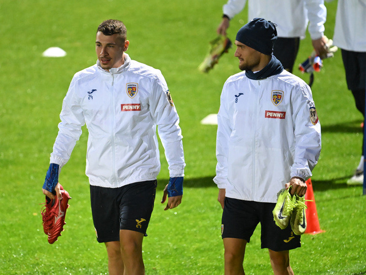 Descriere: Fotbalistii romani Bogdan Racovitan si Daniel Birligea la antrenamentul oficial de dinaintea meciului amical impotriva Moldovei, desfasurat la Centrul National de Fotbal de la Mogosoaia, miercuri 8 octombrie 2025. © FOTO:Razvan Pasarica/SPORT PICTURES
