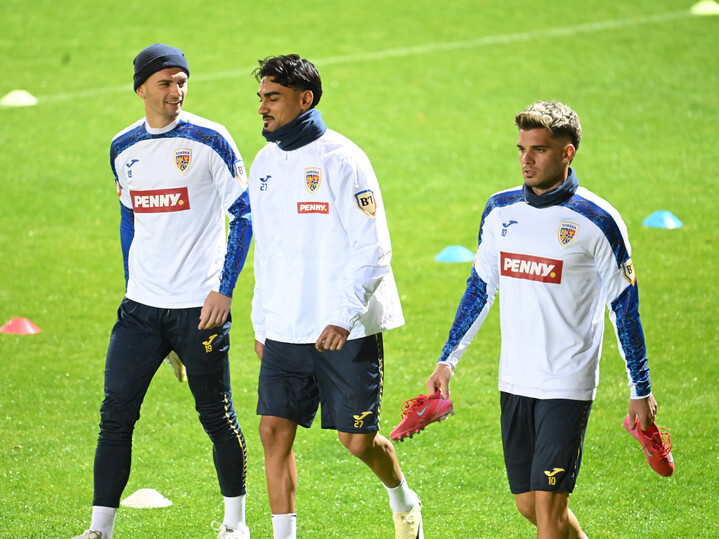 Descriere: Fotbalistii romani Florin Tanase, Stefan Baiaram si Ianis Hagi la antrenamentul oficial de dinaintea meciului amical impotriva Moldovei, desfasurat la Centrul National de Fotbal de la Mogosoaia, miercuri 8 octombrie 2025. © FOTO:Razvan Pasarica/SPORT PICTURES