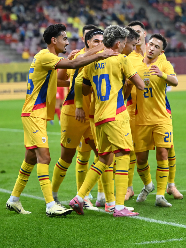 Descriere: Fotbalistii romani Stefan Baiaram, Ianis Hagi, Louis Munteanu si Olimpiu Morutan se bucura dupa un gol marcat in meciul amical de fotbal dintre Romania si Moldova, desfasurat pe Arena Nationala din Bucuresti, joi 9 octombrie 2025. © FOTO:Razvan Pasarica/SPORT PICTURES