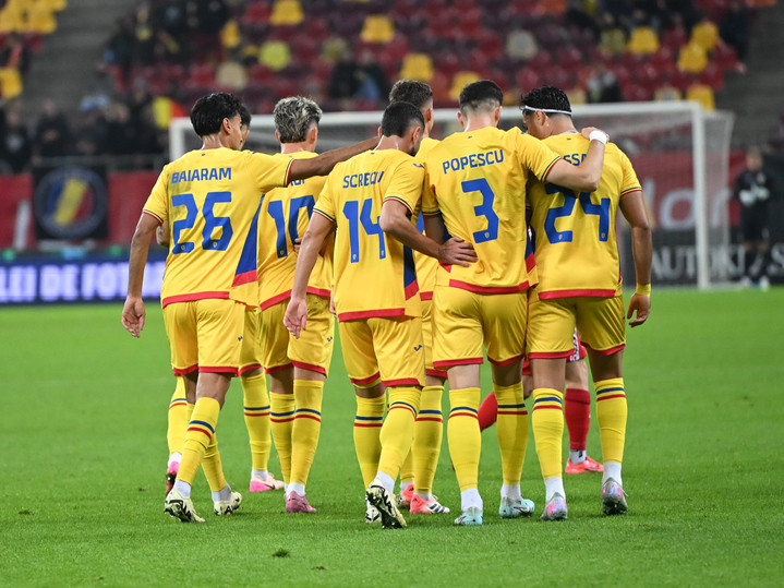Descriere: Bucurie a fotbalistilor romani Vladimir Screciu, Stefan Baiaram, Ianis Hagi, Mihai Popescu si Lisav Eissat dupa un gol marcat in meciul amical de fotbal dintre Romania si Moldova, desfasurat pe Arena Nationala din Bucuresti, joi 9 octombrie 2025. © FOTO:Razvan Pasarica/SPORT PICTURES