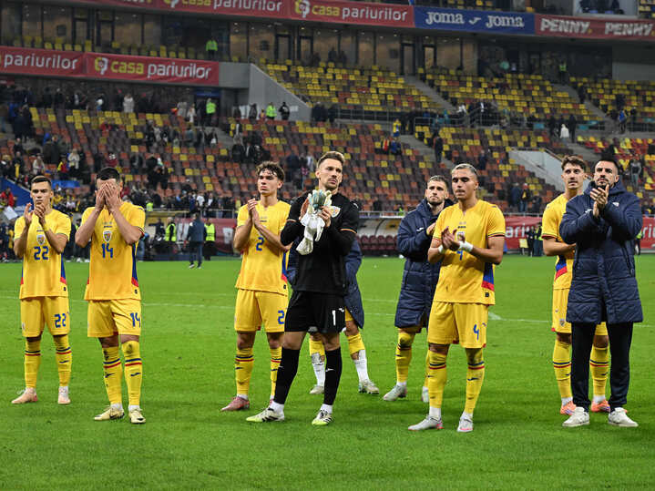 Descriere: Fotbalistii romani Catalin Carjan, Vladimir Screciu, Kevin Ciubotaru, Ionut Radu, Vlad Dragomir, Cristian Manea, David Miculescu si Andrei Burca saluta galeria dupa meciul amical de fotbal dintre Romania si Moldova, desfasurat pe Arena Nationala din Bucuresti, joi 9 octombrie 2025. © FOTO:Razvan Pasarica/SPORT PICTURES