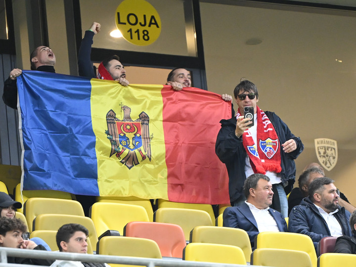 Descriere: Roman Iagupov (in dreapta cu ochelari), solistul trupei Zdob si Zdub, alaturi de steagul Moldovei la meciul amical de fotbal dintre Romania si Moldova, desfasurat pe Arena Nationala din Bucuresti, joi 9 octombrie 2025. © FOTO:Razvan Pasarica/SPORT PICTURES