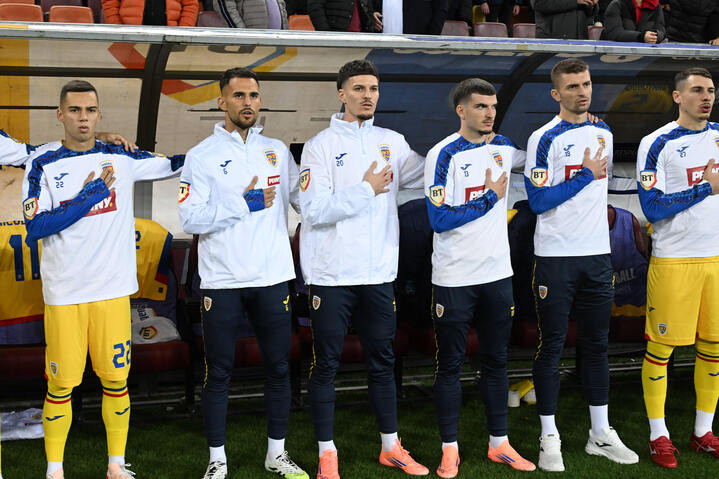 Descriere: Fotbalistii romani Catalin Carjan, Marius Marin, Dennis Man, Valentin Mihaila, Florin Tanase si Bogdan Racovitan la imn pe banca la meciul amical de fotbal dintre Romania si Moldova, desfasurat pe Arena Nationala din Bucuresti, joi 9 octombrie 2025. © FOTO:Razvan Pasarica/SPORT PICTURES
