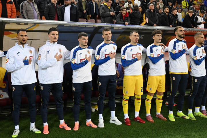 Descriere: Fotbalistii romani Marius Marin, Dennis Man, Valentin Mihaila, Florin Tanase, Bogdan Racovitan, Kevin Ciubotaru, Razvan Sava si Daniel Birligea la imn pe banca la meciul amical de fotbal dintre Romania si Moldova, desfasurat pe Arena Nationala din Bucuresti, joi 9 octombrie 2025. © FOTO:Razvan Pasarica/SPORT PICTURES