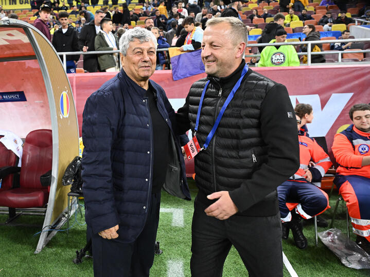 Descriere: Cei doi antrenori Mircea Lucescu si Lilian Popescu se saluta inaintea meciului amical de fotbal dintre Romania si Moldova, desfasurat pe Arena Nationala din Bucuresti, joi 9 octombrie 2025. © FOTO:Razvan Pasarica/SPORT PICTURES