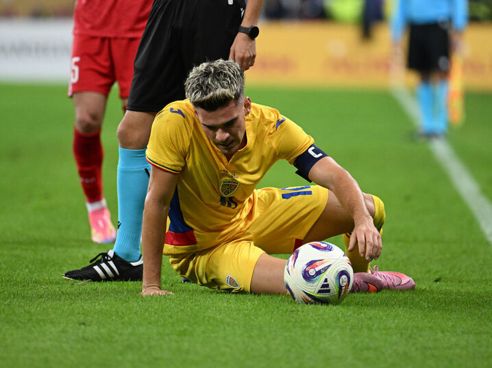 Descriere: Ianis Hagi la pamant in meciul amical de fotbal dintre Romania si Moldova, desfasurat pe Arena Nationala din Bucuresti, joi 9 octombrie 2025. © FOTO:Razvan Pasarica/SPORT PICTURES