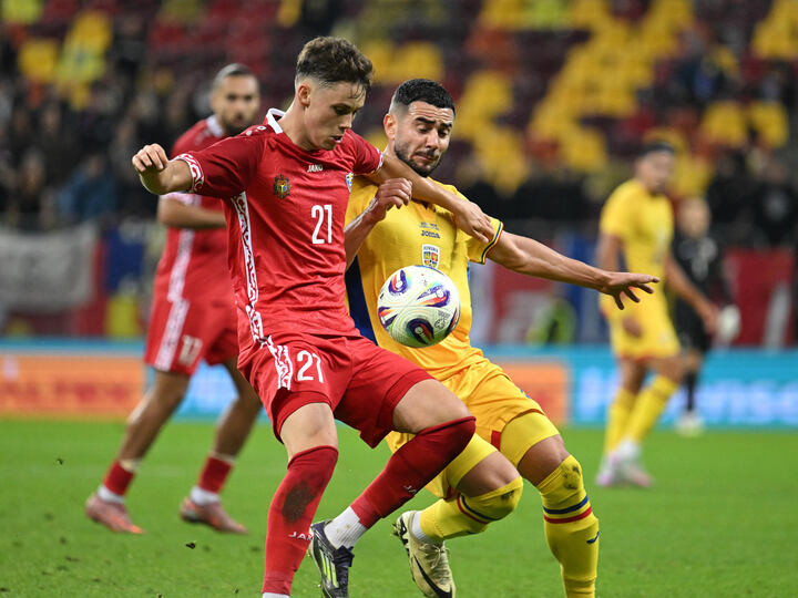 Descriere: Sergiu Perciun si Vladimir Screciu in meciul amical de fotbal dintre Romania si Moldova, desfasurat pe Arena Nationala din Bucuresti, joi 9 octombrie 2025. © FOTO:Razvan Pasarica/SPORT PICTURES