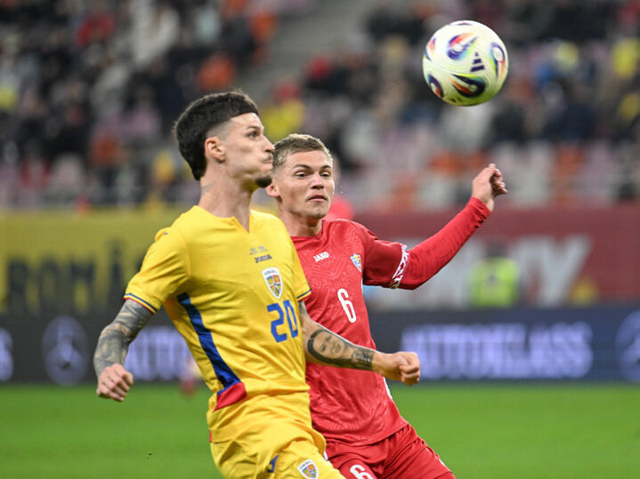 Descriere: Dennis Man si Mihail Gherasimencov in meciul amical de fotbal dintre Romania si Moldova, desfasurat pe Arena Nationala din Bucuresti, joi 9 octombrie 2025. © FOTO:Razvan Pasarica/SPORT PICTURES