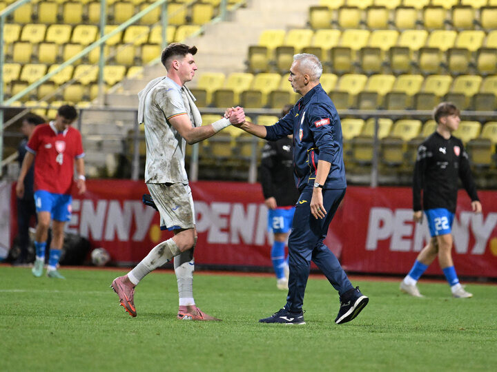 Descriere: Adrian Iencsi il felicita pe Codrut Sandu dupa meciul de fotbal dintre Romania U20 si Cehia U20, contand pentru Elite League U20, desfasurat pe Stadionul comunal Concordia din Chiajna, vineri 10 octombrie 2025. © FOTO:Razvan Pasarica/SPORT PICTURES