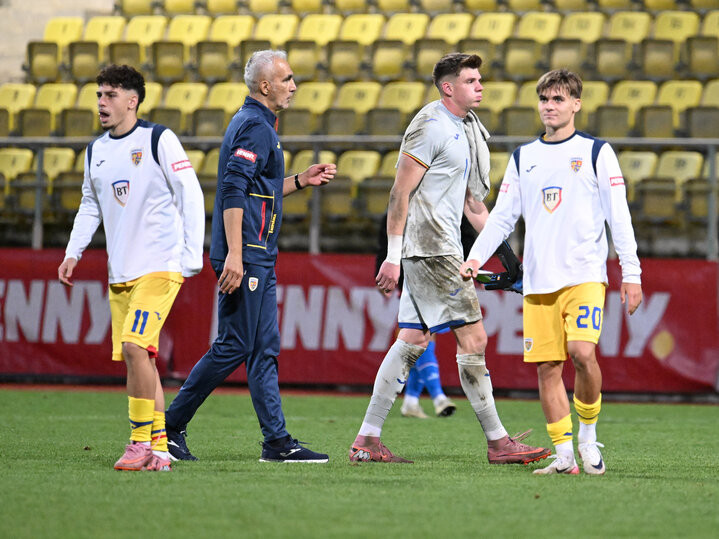 Descriere: Adrian Iencsi il felicita pe Codrut Sandu de langa David Pacuraru si David Matei dupa meciul de fotbal dintre Romania U20 si Cehia U20, contand pentru Elite League U20, desfasurat pe Stadionul comunal Concordia din Chiajna, vineri 10 octombrie 2025. © FOTO:Razvan Pasarica/SPORT PICTURES