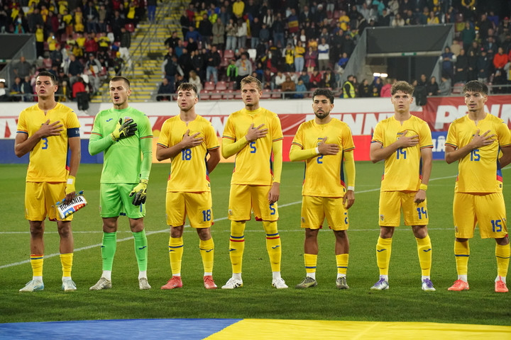 Descriere: Fotbalistii romani la intonarea imnului national inaintea meciului amical de fotbal dintre Romania U21 si Serbia U21, desfasurat pe Stadionul Francisc Neuman din Arad, vineri 10 octombrie 2025. © FOTO:Alexandra Fechete/SPORT PICTURES