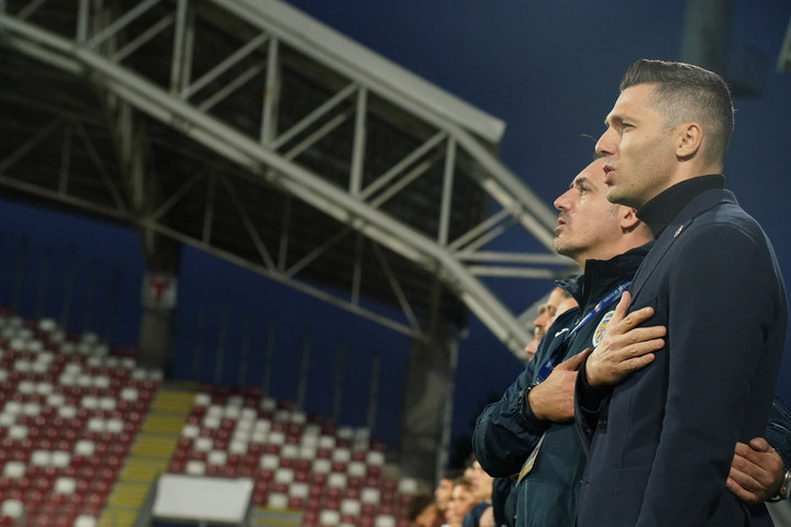 Descriere: Costin Curelea si staful tehnic la intonarea imnului national inaintea meciului amical de fotbal dintre Romania U21 si Serbia U21, desfasurat pe Stadionul Francisc Neuman din Arad, vineri 10 octombrie 2025. © FOTO:Alexandra Fechete/SPORT PICTURES